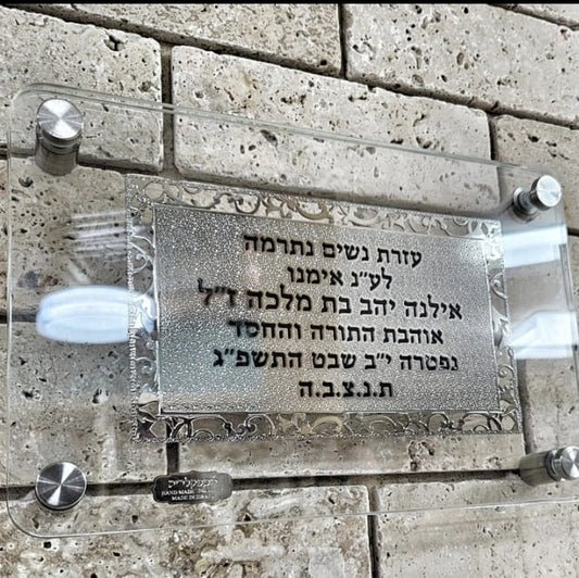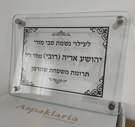 שלט לעילוי נשמת עם זכוכית מחוסמת