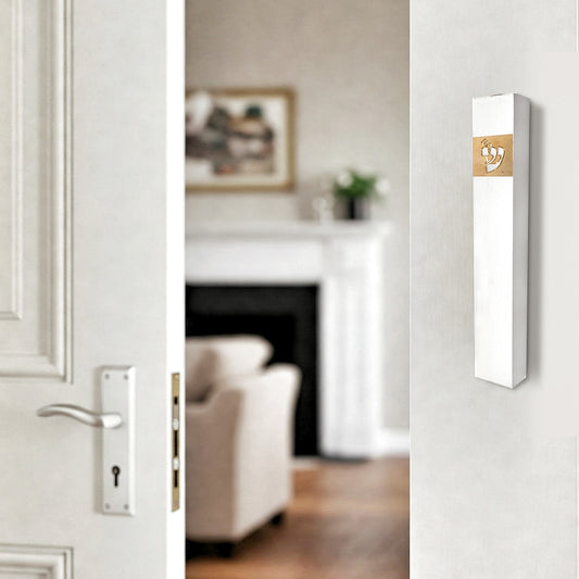 בית מזוזה מעץ לבן בעיצוב אומנותי בשילוב ש מקראית ציפוי כסוף