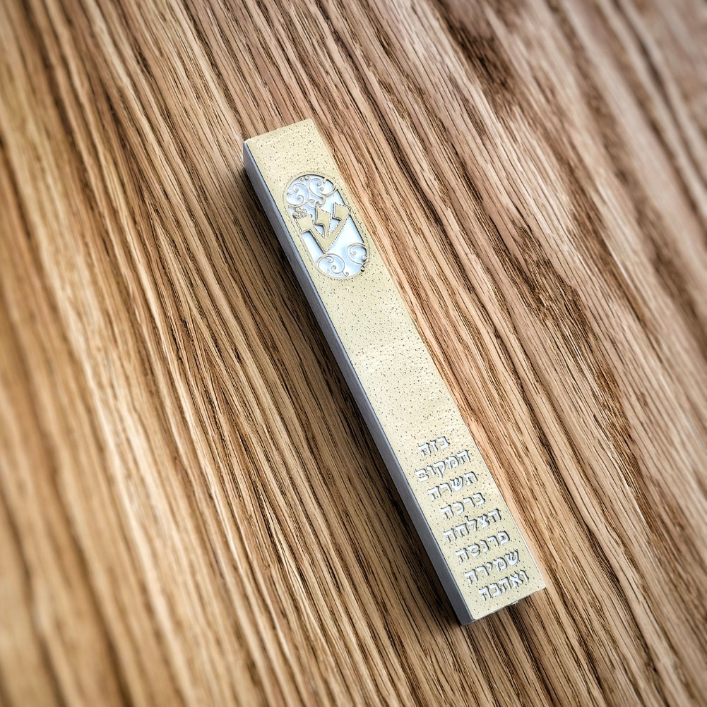 בית מזוזה עץ מלא, צבע לבן בעיצוב אומנותי, שילוב זהב טהור
