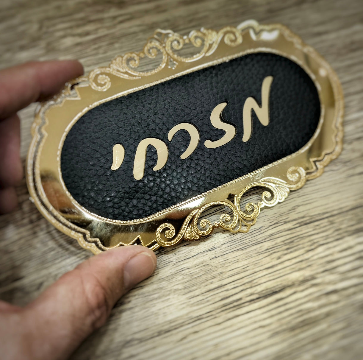 זהו שלט בית אלגנטי בציפוי זהב, המיועד לדלת. השלט כולל מסגרת זהב מורכבת עם דוגמאות חיתוך לייזר מפורטות המקיפות פנל אובאלי מרכזי. לפנל המרכזי יש טקסטורה מנצנצת ומבריקה בגוון זהב-וורוד או נחושת-זהב. המילה העברית "כהן" מוצגת באופן בולט באותיות שחורות החתוכות מבד או מעור מעובד, ויוצרות ניגוד יפה על רקע הנצנצים. העיצוב הכללי מרמז על פריט יוקרתי ומותאם אישית לבית.