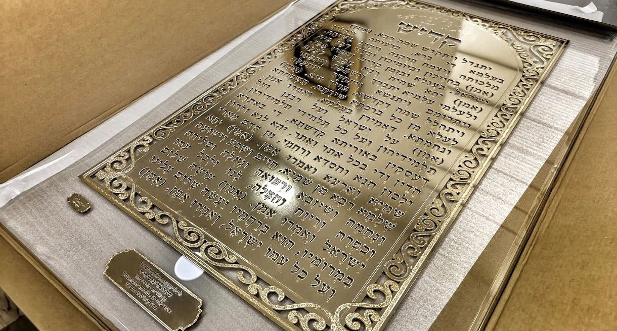 קדיש הוא אחת התפילות המרכזיות והחשובות ביהדות, ושלט קדיש נמצא במקום בולט בבית הכנסת. ציפוי זהב 18K מבטיח שהשלט יישאר מכובד ויפה לדורות, ומבטא את הכבוד והחשיבות שאנחנו נותנים לתפילה הזו.
