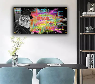 538 – ציור מלבני של הרבי מליובאוויטש על רקע שמות מדינות העולם על קנבס או זכוכית